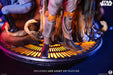 El Busto de Bellas Artes de Boba Fett cuenta con iluminación LED que añade una sensación extra de emoción y dramatismo a esta pieza, ya de por sí asombrosa. El cálido resplandor que emana del suelo de la cámara de congelación de carbonita ilumina un elemento destacado de la pieza: una estatua del inquietantemente estoico Boba Fett junto a su presa congelada.