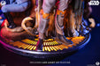 El Busto de Bellas Artes de Boba Fett cuenta con iluminación LED que añade una sensación extra de emoción y dramatismo a esta pieza, ya de por sí asombrosa. El cálido resplandor que emana del suelo de la cámara de congelación de carbonita ilumina un elemento destacado de la pieza: una estatua del inquietantemente estoico Boba Fett junto a su presa congelada.