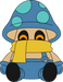 Sentado a 9 pulgadas de alto con un par de pupilas naranjas brillantes que brillan desde los agujeros negros de los ojos y una cabeza que se asemeja a un sombrero de hongo azul moteado, una bufanda amarilla que envuelve su cara bronceada con el extremo cayendo sobre su pecho.