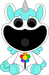 Mide 23 cm de alto, tiene una enorme boca abierta que se extiende en una amplia sonrisa desconcertante que revela un pequeño tubo de aire, ojos redondos oscuros adornan su cara blanca debajo de una melena azul brillante y un cuerno puntiagudo con orejas largas y redondeadas a cada lado. Con una flor multicolor en el pecho, brazos y piernas largos se extienden desde un cuerpo redondeado, sus manos y pies combinan con su melena azul mientras una cola esponjosa se extiende desde su espalda.